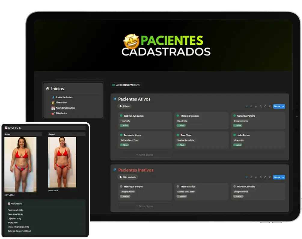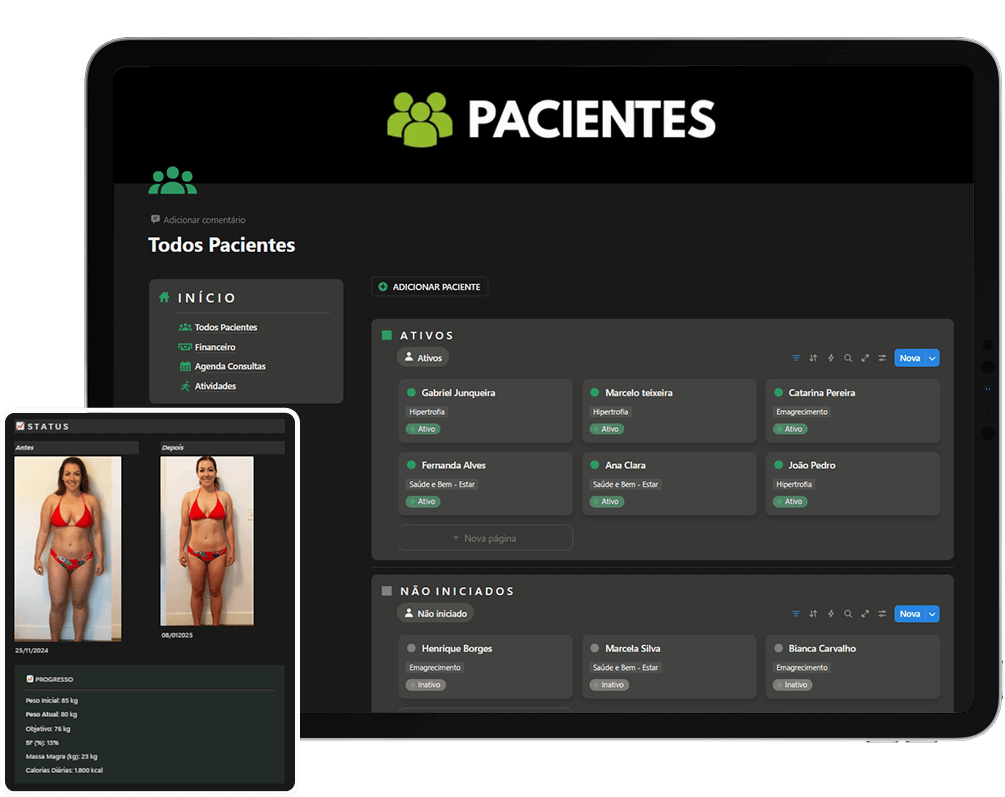 Consigo visualizar o progresso de cada paciente, organizar as dietas e até anotar insights de estudo e marketing. Simples, bonito e funcional.